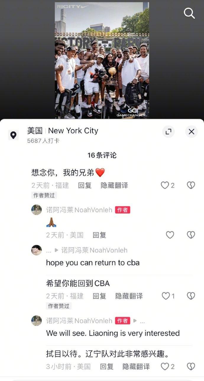 期待你回CBA!冯莱社媒回复:辽宁对我非常感兴趣