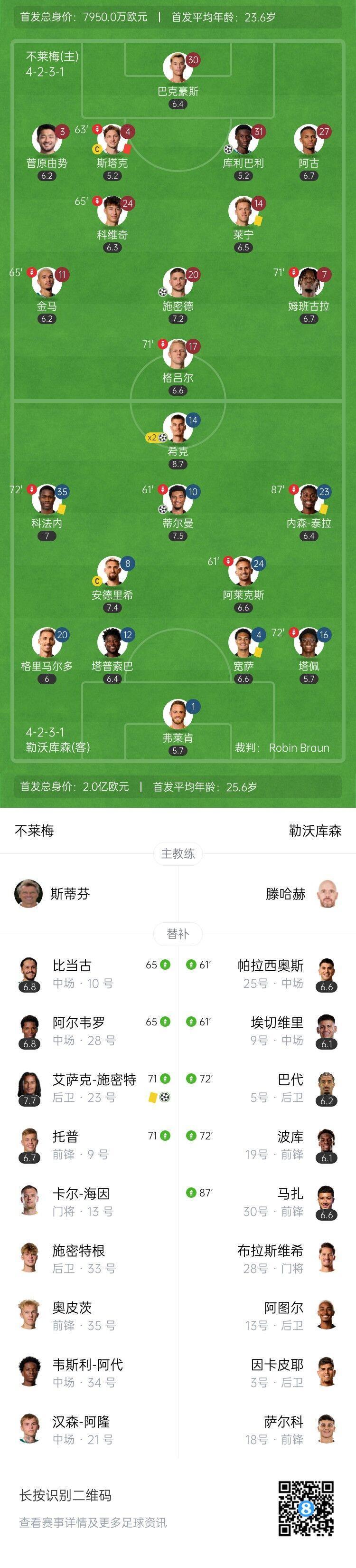 第94分钟,不莱梅最后一攻发起狂轰滥炸,库利巴利门前补射洞穿近角!3-3!十人不莱梅最后时刻绝平!↓